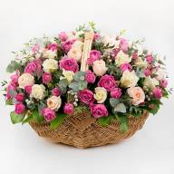 Стильная корзина в этой композиции наполнена одноголовыми и кустовыми розами, которые вместе смотрятся очень привлекательно. Здесь преобладают белые и розовые цвета, символизирующие чистоту, открытость, невинность и приближающееся счастье. Корзина цветов отлично подойдет для подарка семье по любому поводу, даже для принесения извинений.